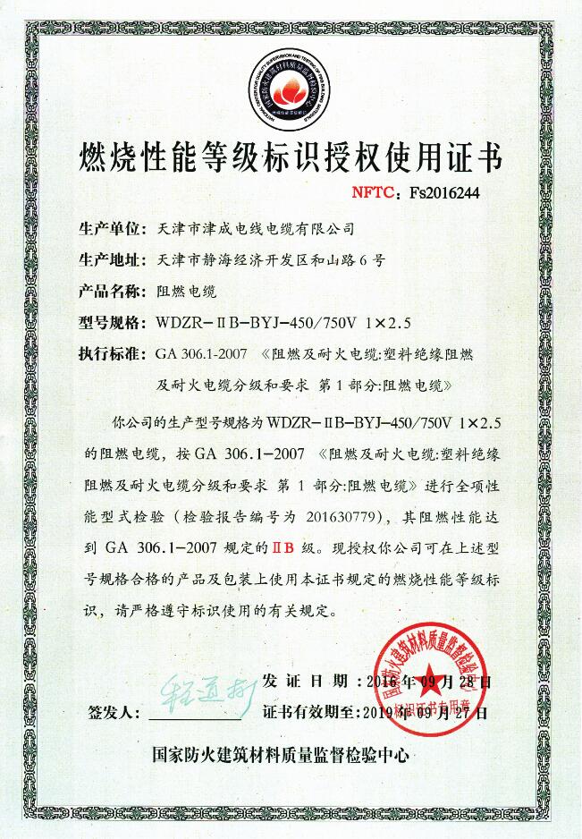 燃燒性能等級標識授權證使用證書
